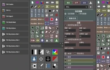 Combo和Cx模块将许多常见的Photoshop功能整合到一个紧凑的模块中。用户可以通过按钮轻松运行Photoshop操作,如图层蒙版计算、网页锐化、添加水印等。这个模块的设计非常直观,按钮分组,用户可以快速找到所需的功能。