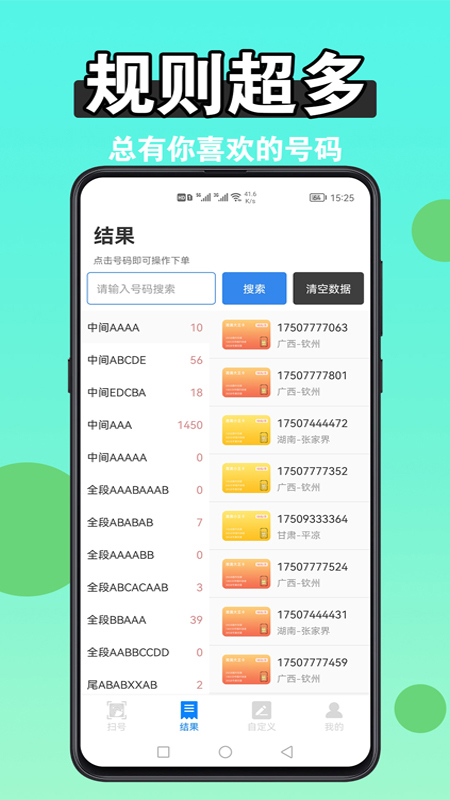 软件名称:天天靓号应用包名:com.saohao.tiantian软件版本:8.0.2软件语言:简体中文软件大小:14MB软件分类:工具授权方式:公益运行环境:安卓系统软件下载地址:https://wwc.lanzoub.com/igQl401ylpna软件介绍:【天天靓号】一款最专业手机靓号扫号工具,可以多线程扫全国各地所有主流卡种靓号!支持扫多种类型,支持自定义,支持一键下单,订单查询等,扫到靓号直接一键下单!简单、易懂,适合所有人群使用!
